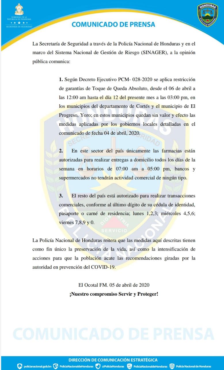Departamento de Cortés y municipio de El Progreso totalmente cerrado a causa del aumento de casos por COVID-19, comunicado